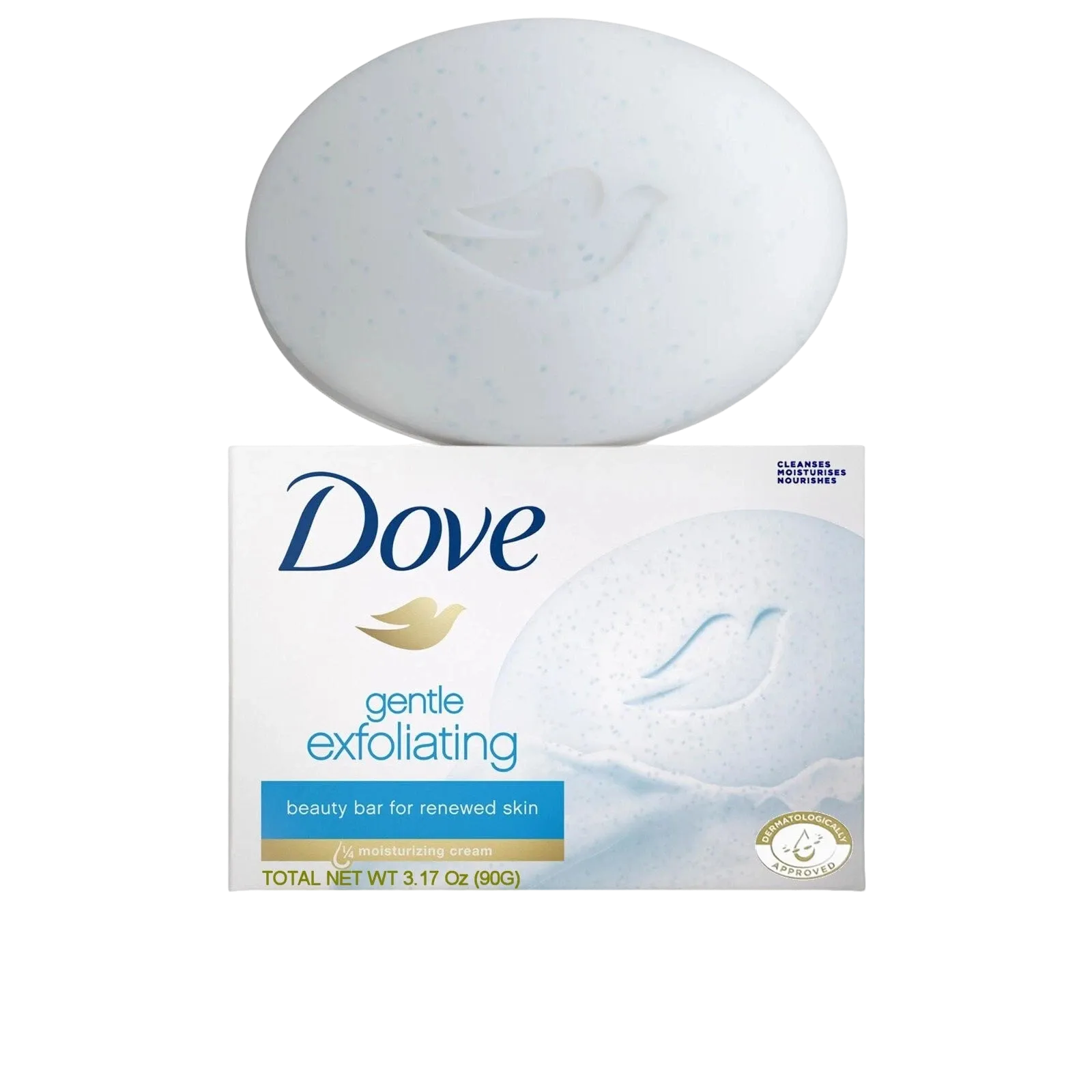 The Dove Gentle Exfoliating Beauty Bar is designed to gently cleanse and exfoliate, leaving skin feeling renewed and nourished. The bar is dermatologically approved and contains 1/4 moisturizing cream to prevent dryness.